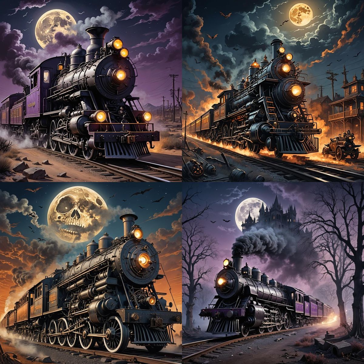 This image shows a vintage steam locomotive driven by a skeleton, leading seven hot rods racing at night. Bats and ghosts fill the sky beneath a full moon in this fantastical digital painting.