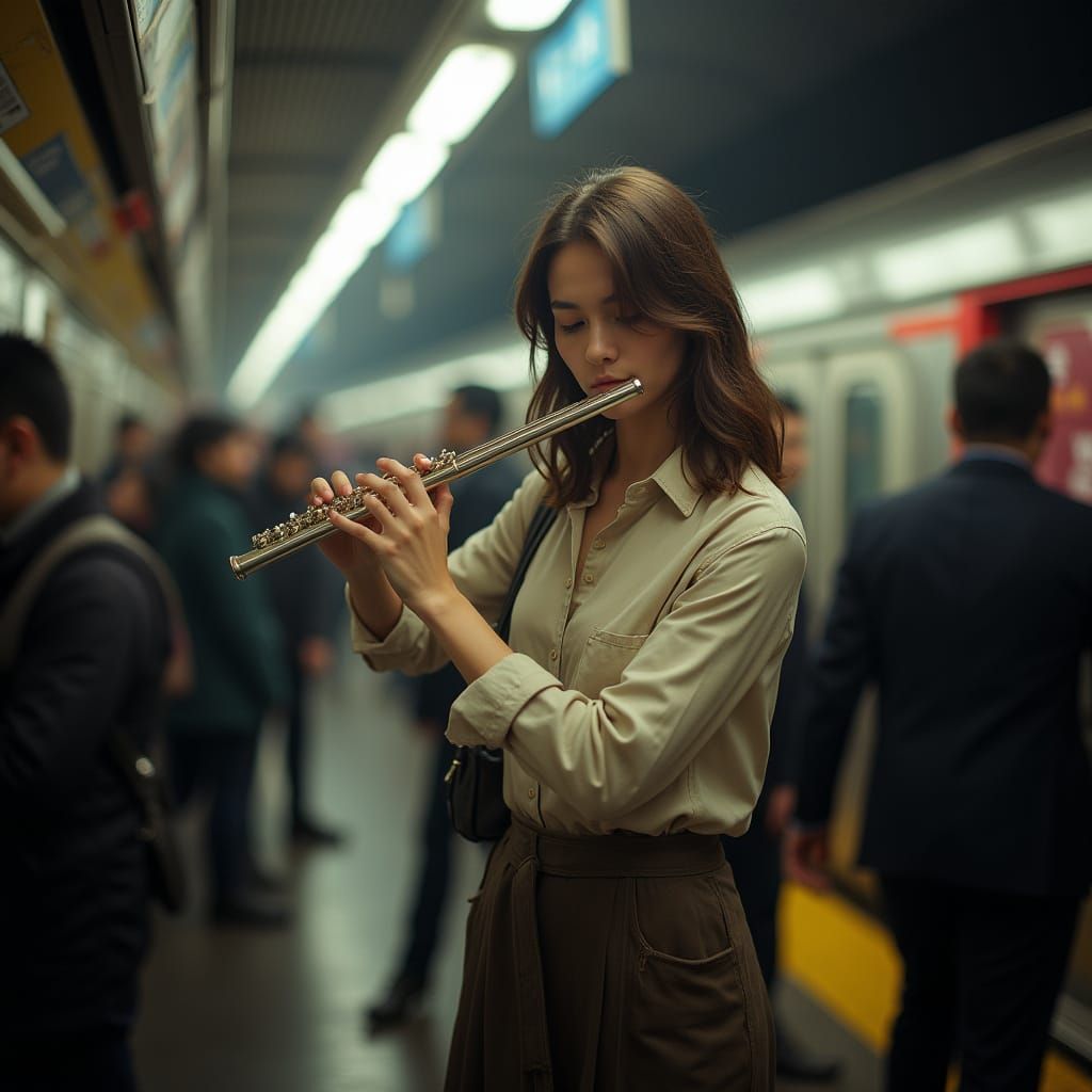 A hyperrealistic action photo shows a woman playing a flute on a busy subway platform, capturing the dynamic energy of urban life with sharp focus and shallow depth of field.