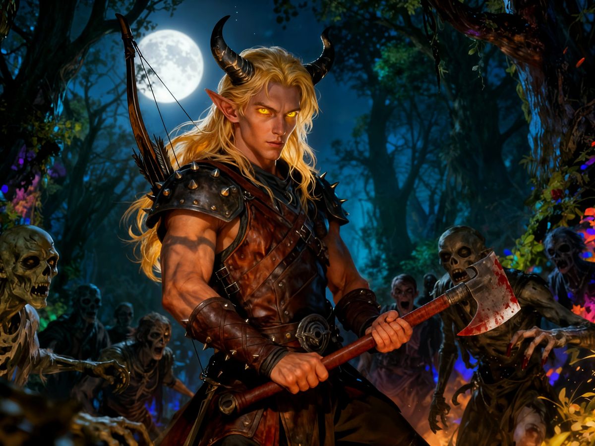 This hyperrealistic image shows a handsome tiefling ranger with blonde hair, wielding a bloody hand axe against a horde of ghouls in a moonlit druid grove. Detailed concept art style.