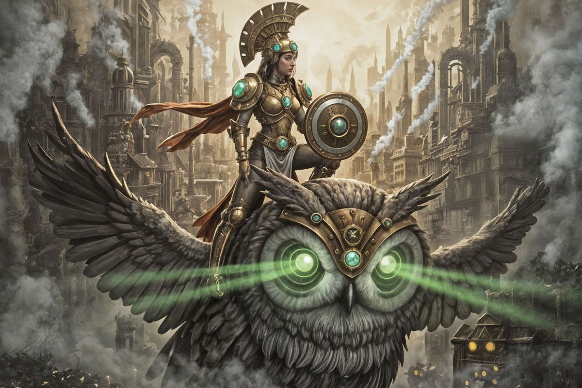 A steampunk Athena, goddess of wisdom and strategic warfare, stands atop a colossal clockwork owl, gazing out over a sprawling, smog-filled cityscape. Her armor is crafted from polished brass and intricate gears, adorned with glowing crystals and intricate filigree. The owl's eyes emit beams of emerald ...