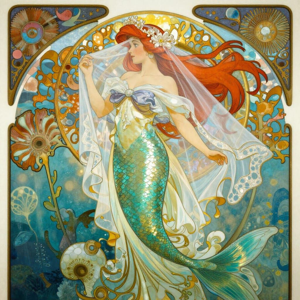 This image showcases Ariel the Little Mermaid wearing a wedding veil, rendered in a vibrant, fantastical Art Nouveau style. It features flowing lines, organic shapes, and a luminous ocean glow.