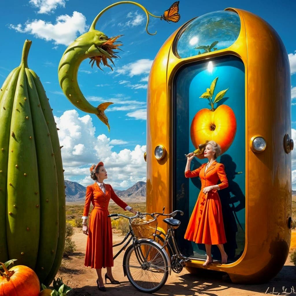 beautiful extravagantly dressed mature lady in stunning fantastic surreal scene; photographically rendered charming expressive face, active motion, highly dynamic posture, realistically depicted harmless fantastic fauna and flora, hyperrealistic fantastic fruit, complex fantastic retrofuturistic scientific ...