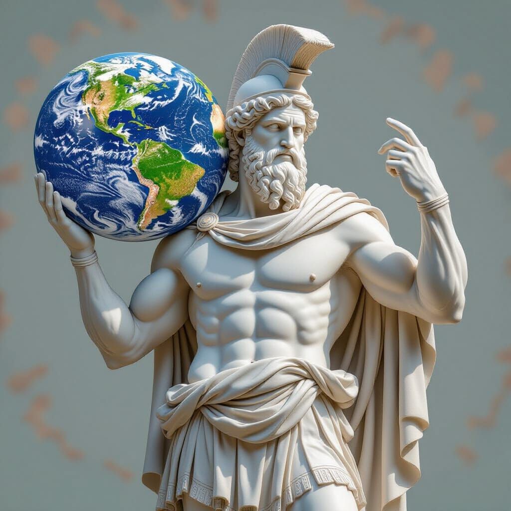 A hyperrealistic image shows Atlas in Greek clothing carrying Earth. The marble statue features detailed textures, dramatic lighting, and a colorful background, in a splash art style reminiscent of Renaissance sculpture.