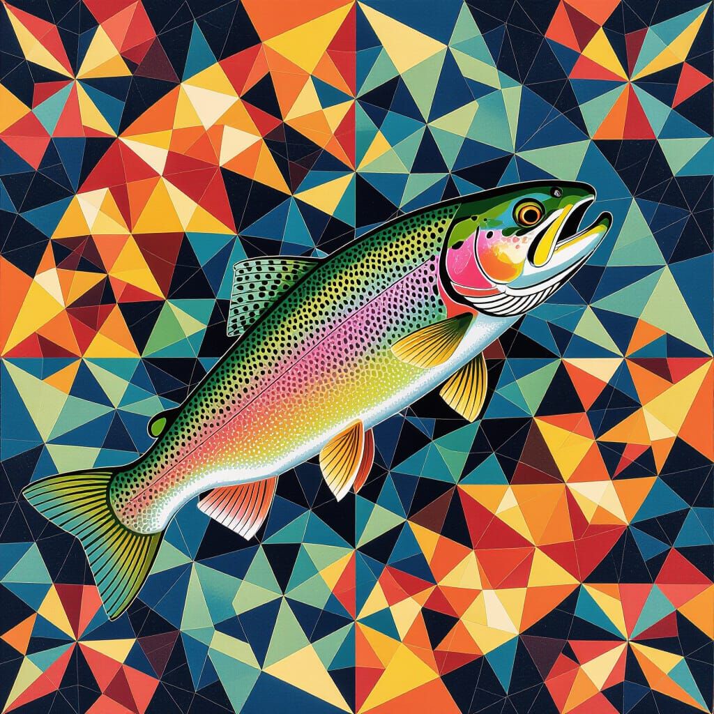 A surreal image of a rainbow trout broken into triangular shapes. The fish swirls in kaleidoscopic patterns, creating a dreamlike, futuristic and tessellated image.