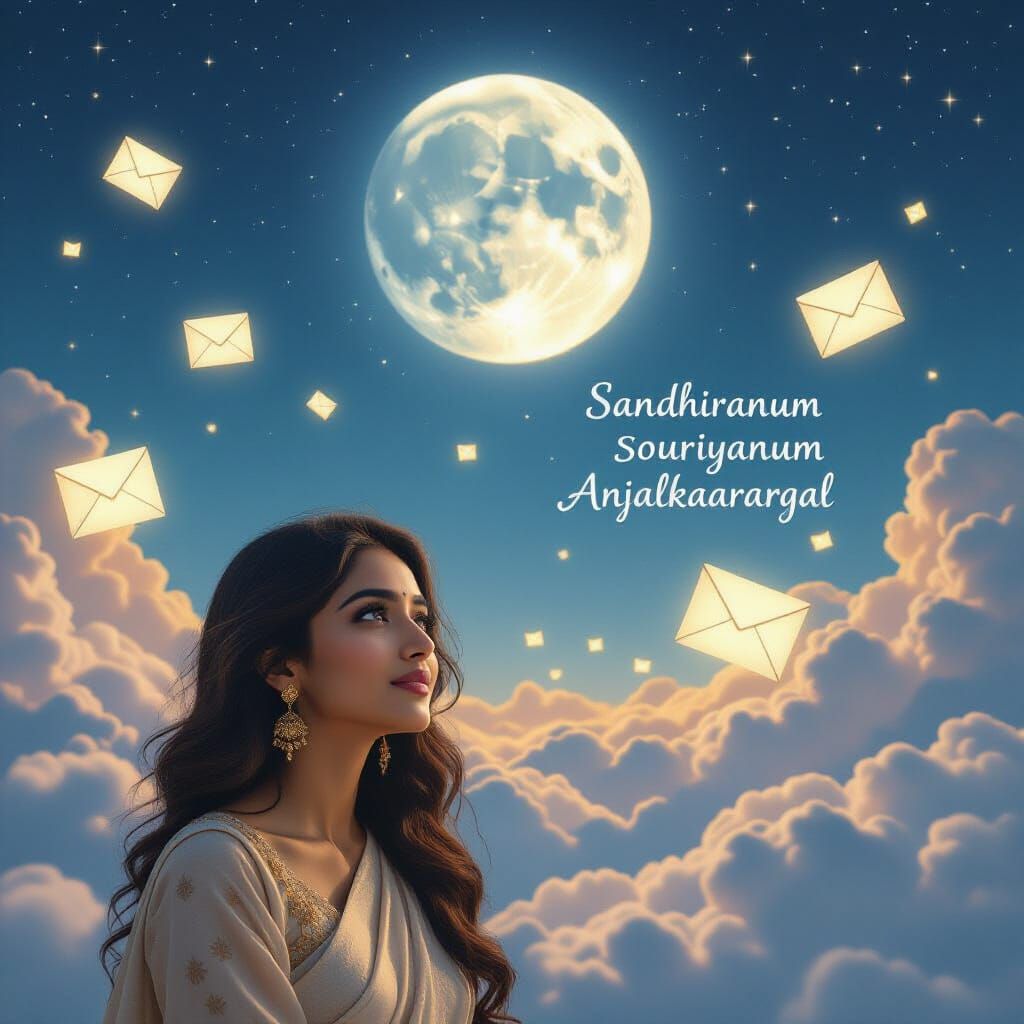 This image depicts a South Asian woman under a surreal sky with both sun and moon visible, symbolizing enduring love. Glowing envelopes drift peacefully, captured in a cinematic, surrealist art style with soft, poetic lighting.