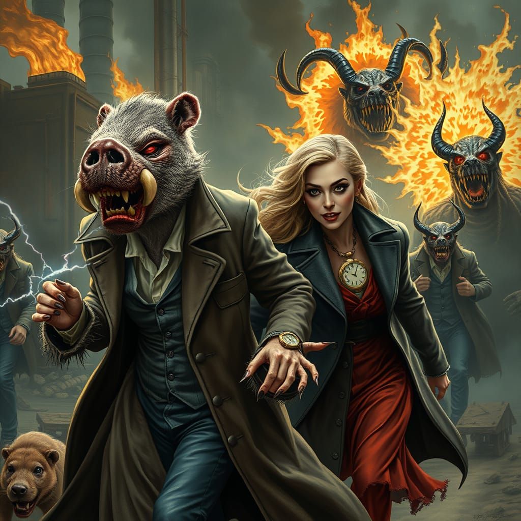 A haunting image of a woman and her monstrous husband fleeing from danger, surrounded by twisted industrial machinery and eerie, humanoid figures, set against a dark, fantastical backdrop reminiscent of the works of Beksiński, Giger, and Frazetta