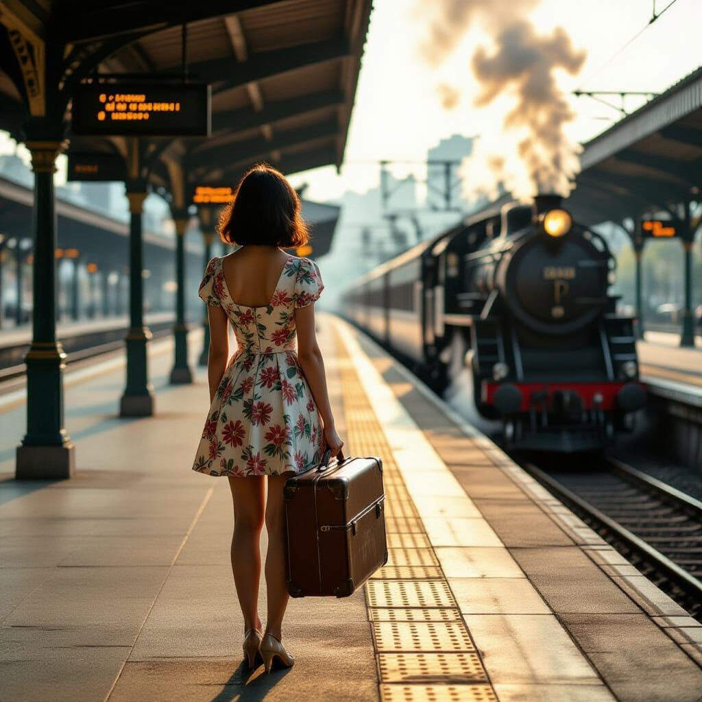 A person in a floral dress hesitates with a suitcase at a sun-drenched train station. Captured with a nostalgic, desaturated film look, evoking melancholy.