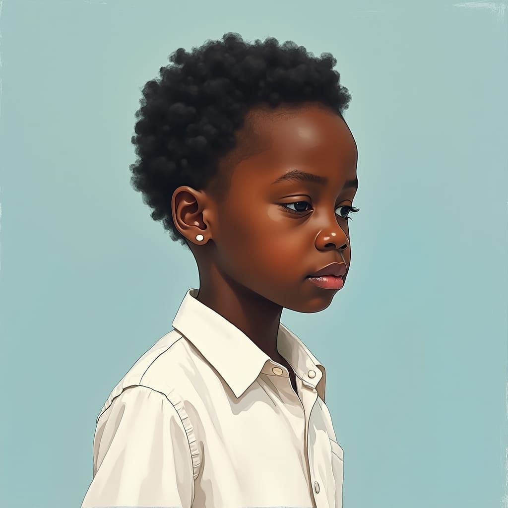 This image shows a sad young child in a white shirt against a blue background. The artwork blends watercolor softness with encaustic textures in an emotive illustration.