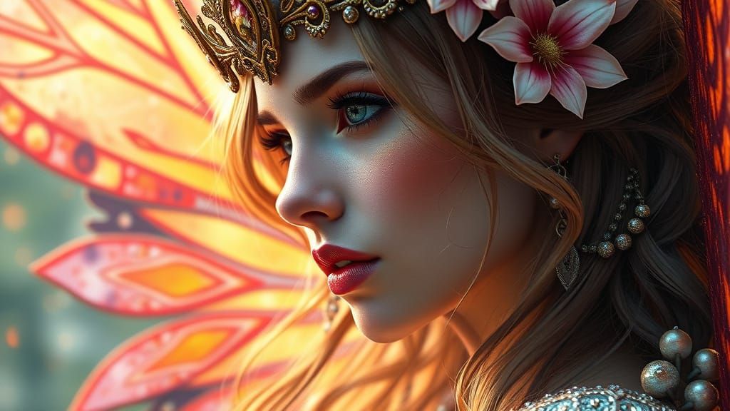 This image captures a hyperrealistic fairy queen in a splash art style. The mid-shot features intricate details, dramatic lighting, and a vibrant, colorful background.