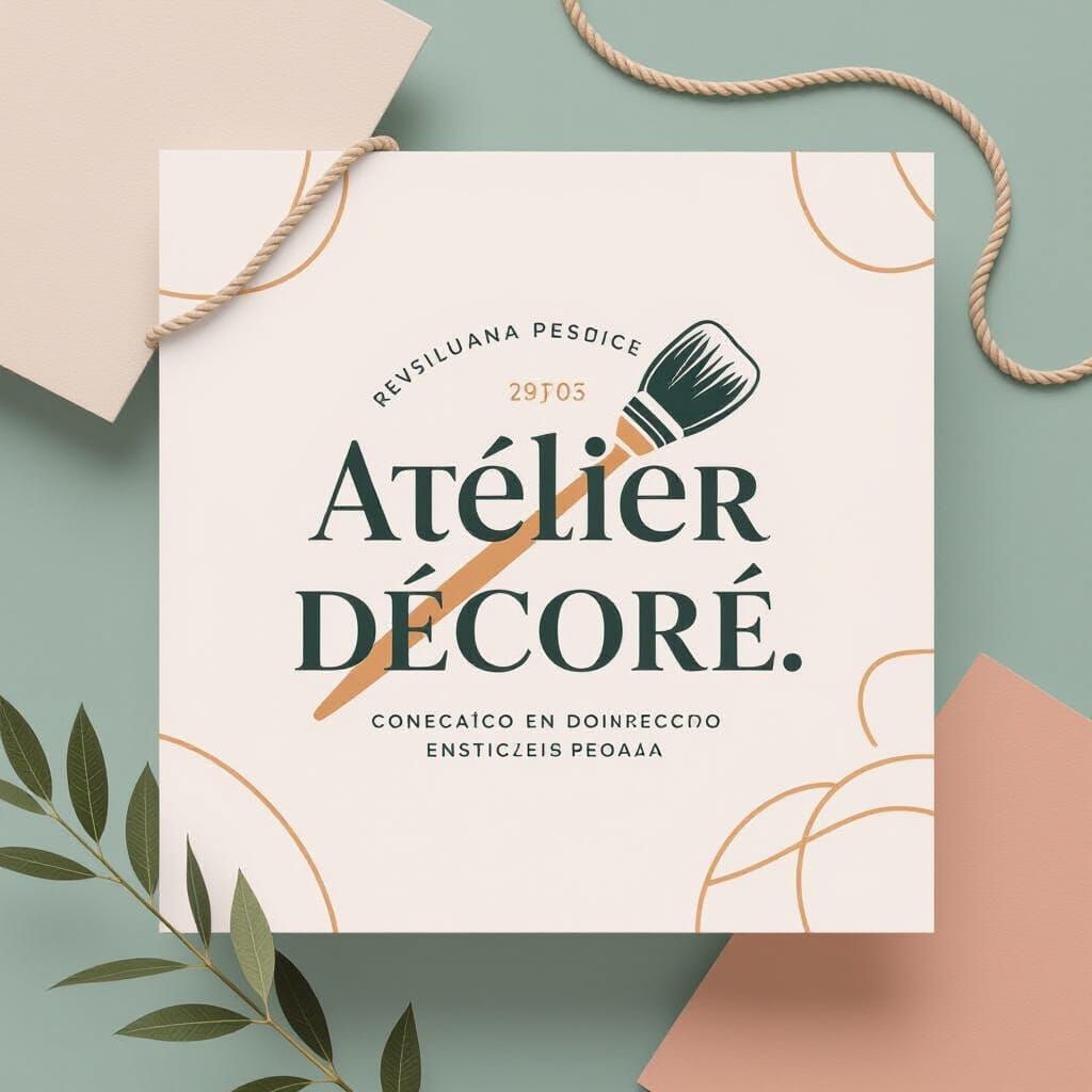 This image features a minimalist and modern vector logo for 'Atelier Decoré'. It uses soft pastel colors and fine lines, with a stylized brush crossing the name to convey creativity and art in decor.
