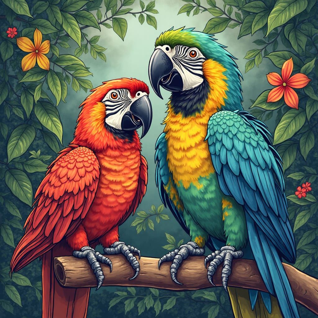 This image shows a vibrant jungle scene filled with exotic animals and lush foliage. A cheerful lion, colorful parrots, flamingos and palm trees create a lively, jubilant atmosphere.