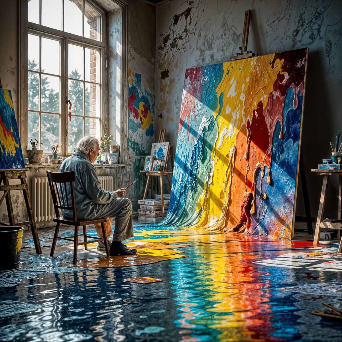 This image shows an elderly artist observing his vibrant painting melt and flow onto the floor. It blends realism and surrealism with a dreamlike atmosphere.