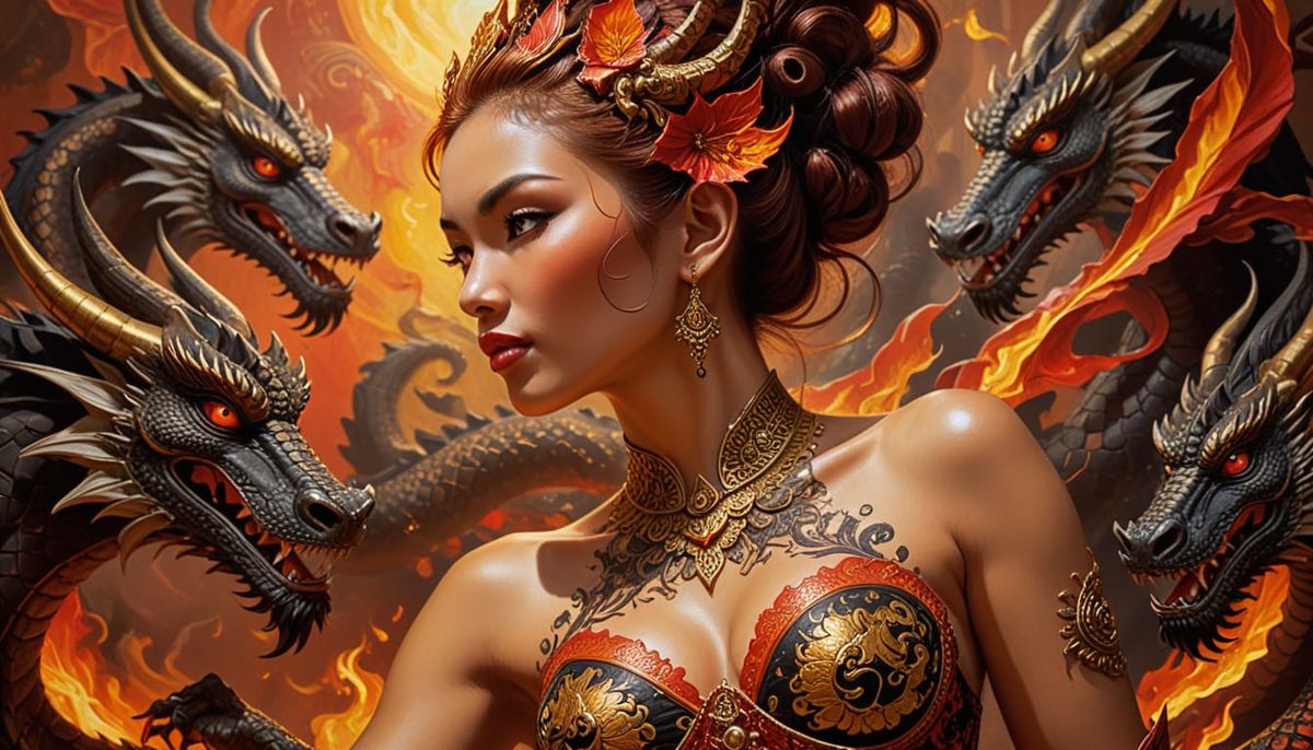 A striking picture of a pin-up goddess with hazel hair and a revealing gauze outfit, encircled by black and red dragons. The vibrant oil painting features warm golden lighting and intricate patterns in an Indonesian style.