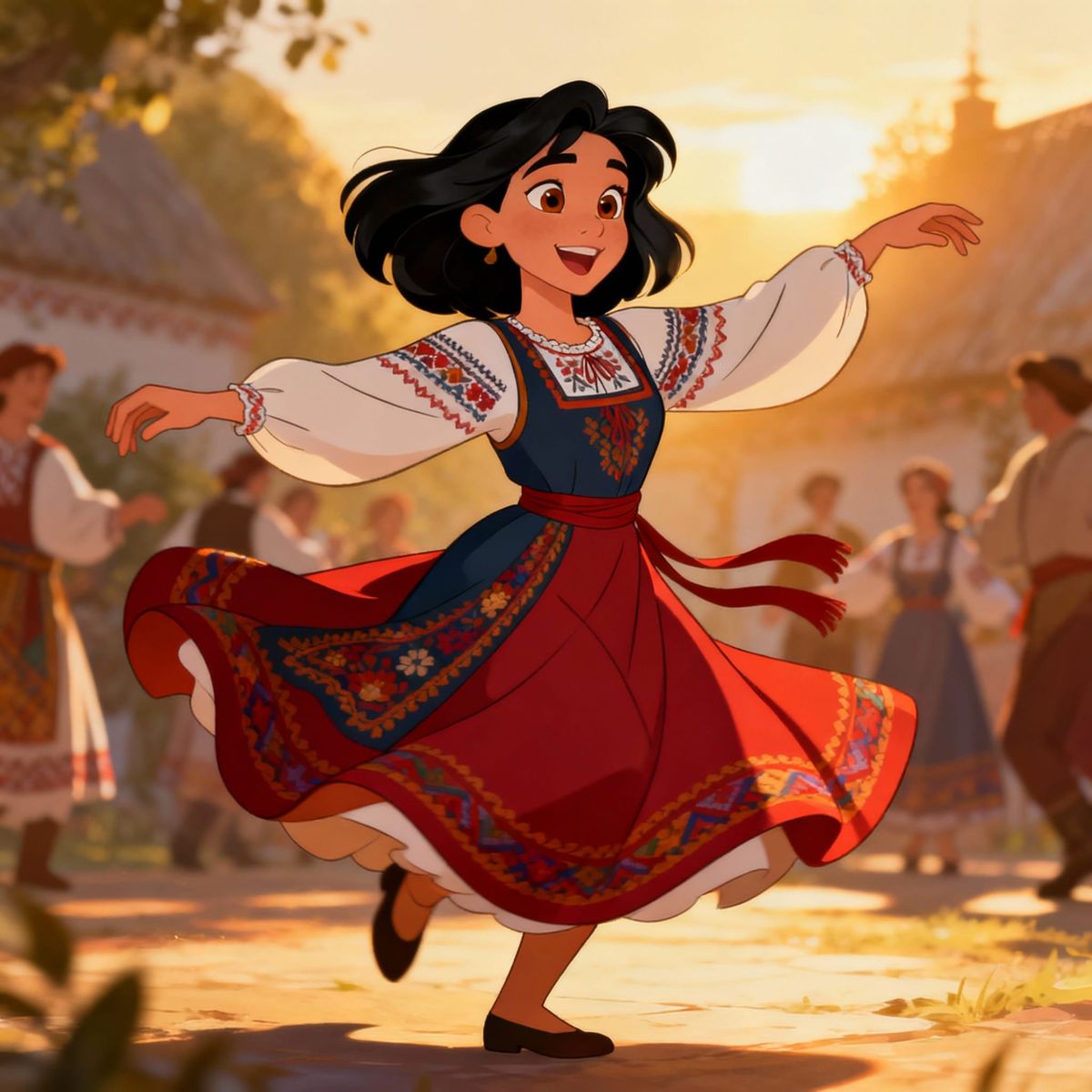 This image depicts a joyful young Hutsulka woman with dark hair and brown eyes, dancing in traditional Zakarpattia clothing. Rendered in a classic Disney animation style with warm lighting.