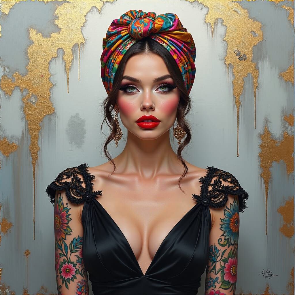 An image of an extremely beautiful white American woman, with prominent lashes/makeup. She’s also wearing a colorful silk head wrap, with a matching black colorful evening gown, with a sleeve of tattoos on both arms, she’s standing in front of a background with a splash of silver/gold/vivid colors, hyperrealistic ...
