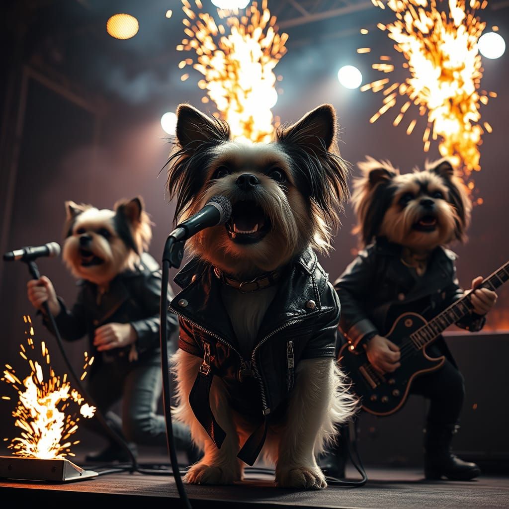 A vivid image of a Shih Tzu rock band performing live. The band members, dressed in leather and spikes, are surrounded by pyrotechnics under flashing lights in a cinematic, moody atmosphere.