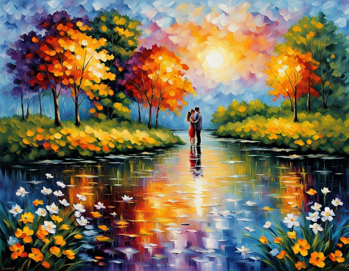 This image captures a romantic moment at a serene pond surrounded by vibrant meadows, featuring bold brushstrokes and an explosion of colors in a neo-impressionist style oil painting