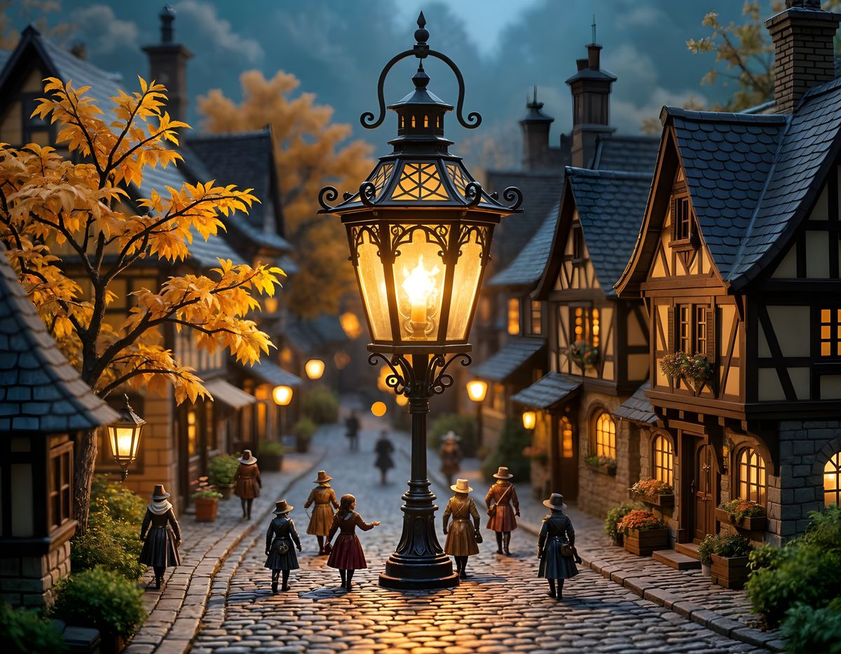 This image showcases a detailed diorama of a steampunk medieval town built inside an ornate lantern, featuring tiny figures and autumn trees. The scene glows with warm, atmospheric light.