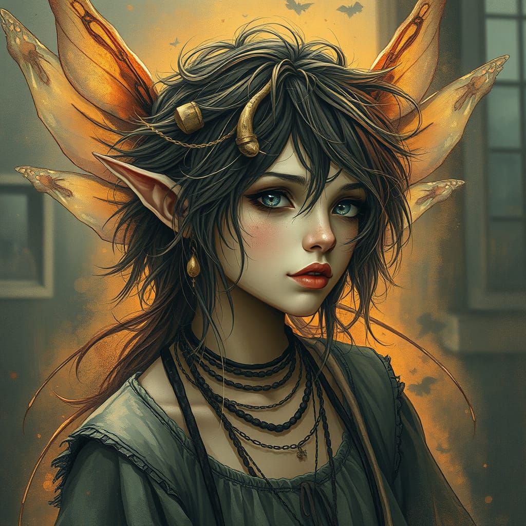 This image shows a mystical fairy with tousled hair and bohemian clothing, set amidst a neo-primitivist baroque cyberpunk environment with a composite photograph feel and mysterious atmosphere, reminiscent of digital art styles by Ash Thorp and Simon Stalenhag.