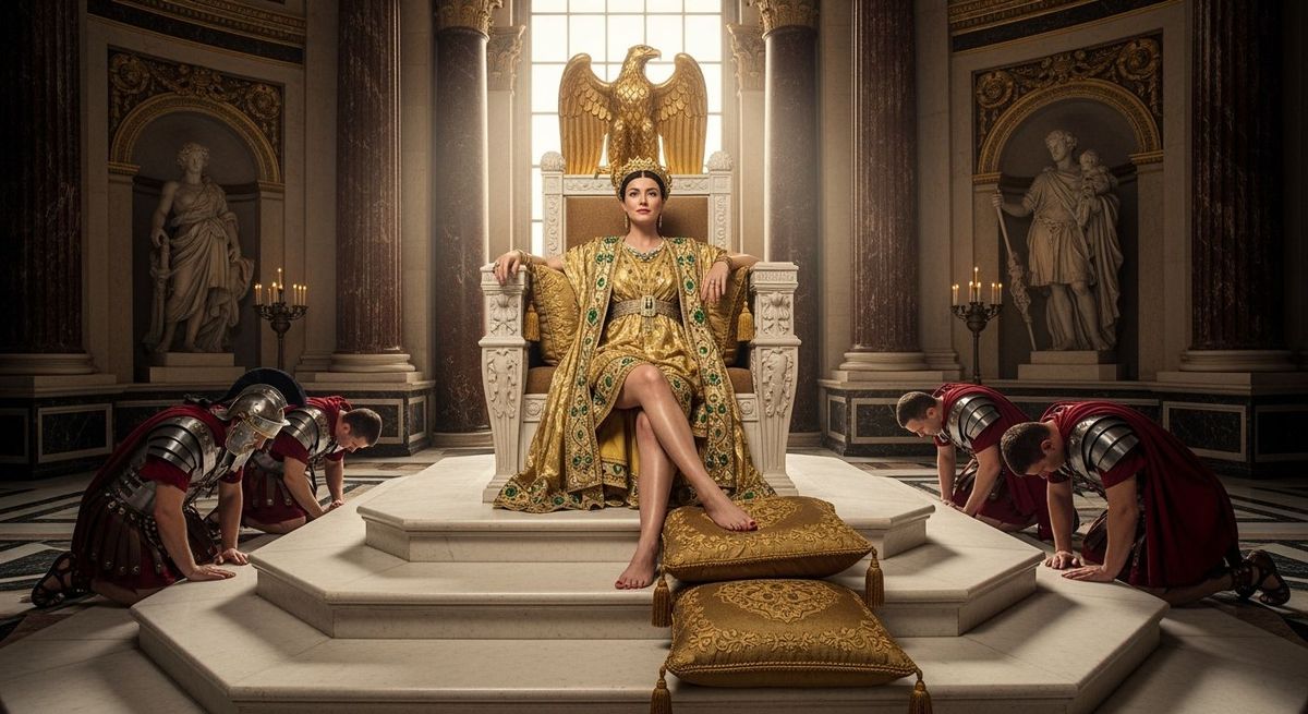 This image portrays Empress Messalina on her ornate throne in a Roman imperial throne room. Legionnaires kneel before her in a grand, well-lit setting featuring towering columns and classical statues, captured with a wide-angle lens.