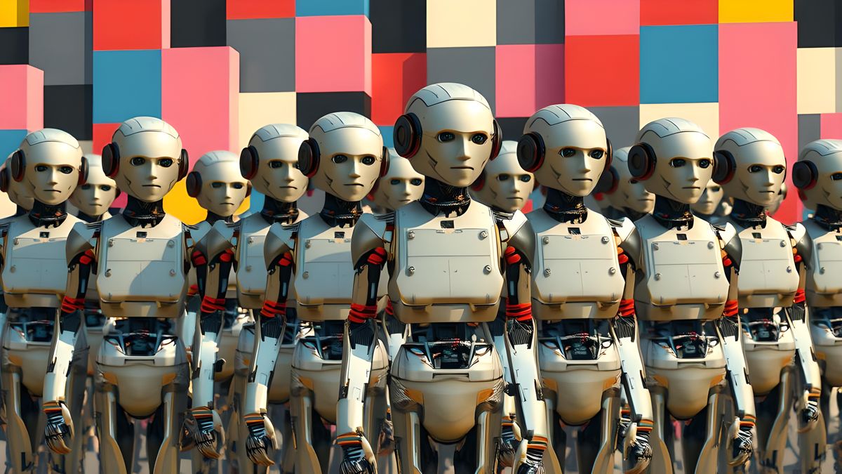 A vivid pop art style portrait of a faceless robot army. The image features advanced electronic parts with 3D shading and subtle hints of color in an anime and manga-inspired aesthetic.