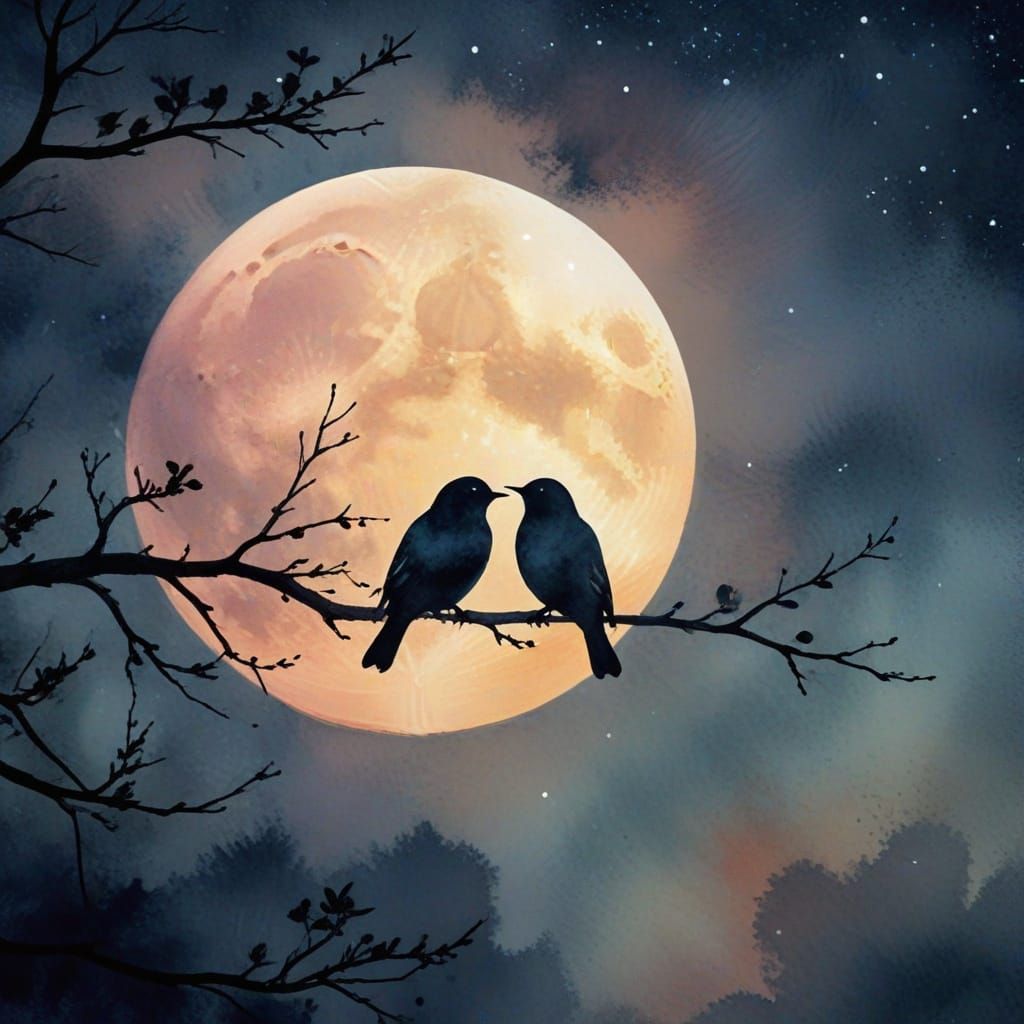 This image shows two birds perched on a branch under a large, glowing moon. Rendered in a delicate watercolor style with soft washes and poetic brushstrokes, it evokes a serene and ethereal atmosphere.