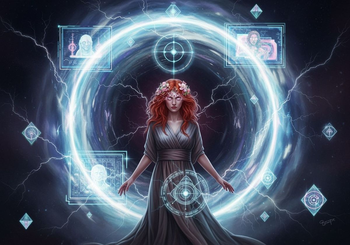 This image shows a red-haired sorceress guarding a shimmering portal to another dimension. Rendered as a digital oil painting with diamond art accents and dramatic lighting, the scene exudes otherworldly energy.