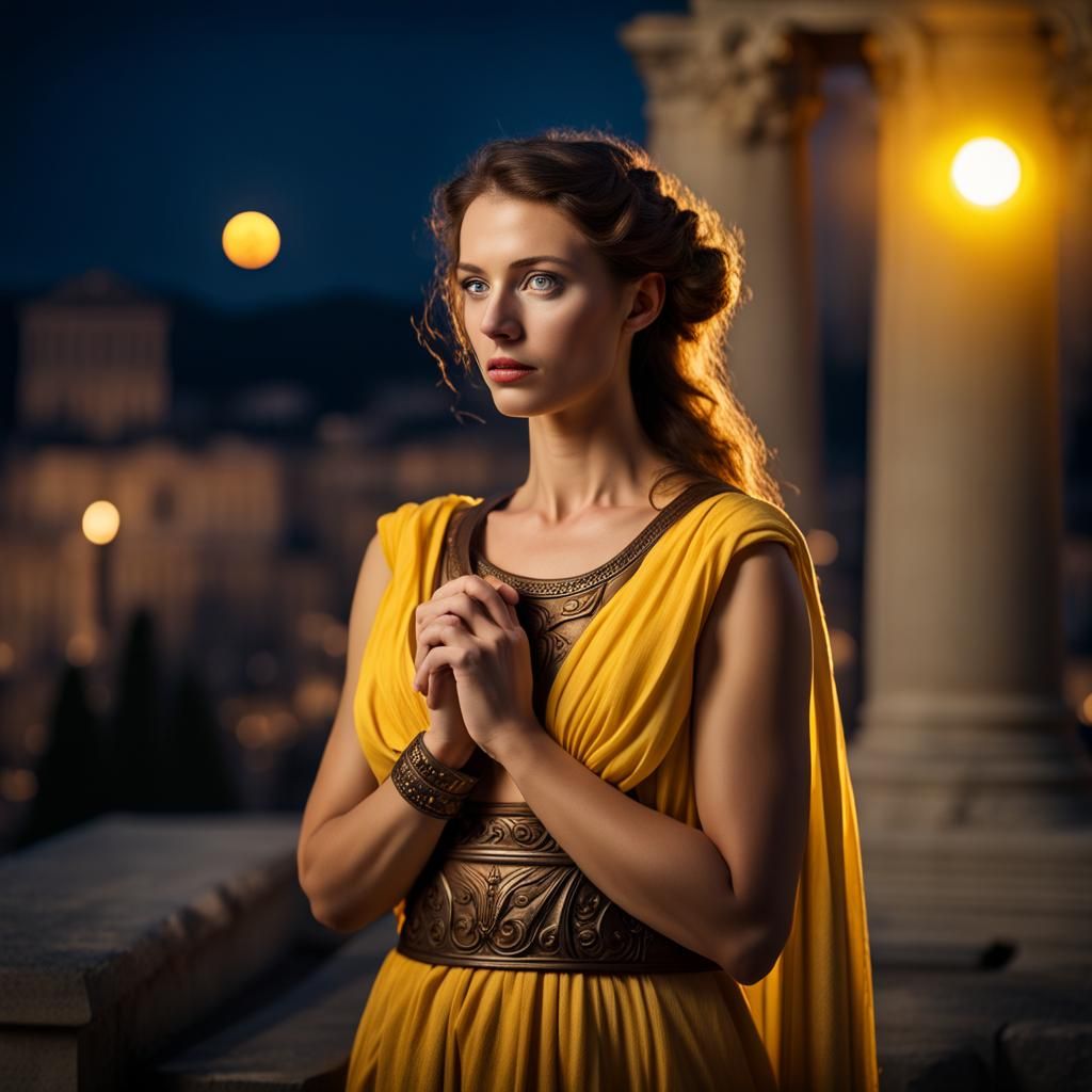 This image shows a stunning Roman woman gazing at the viewer under a bright yellow moon. The photograph features a shallow depth of field and natural lighting.