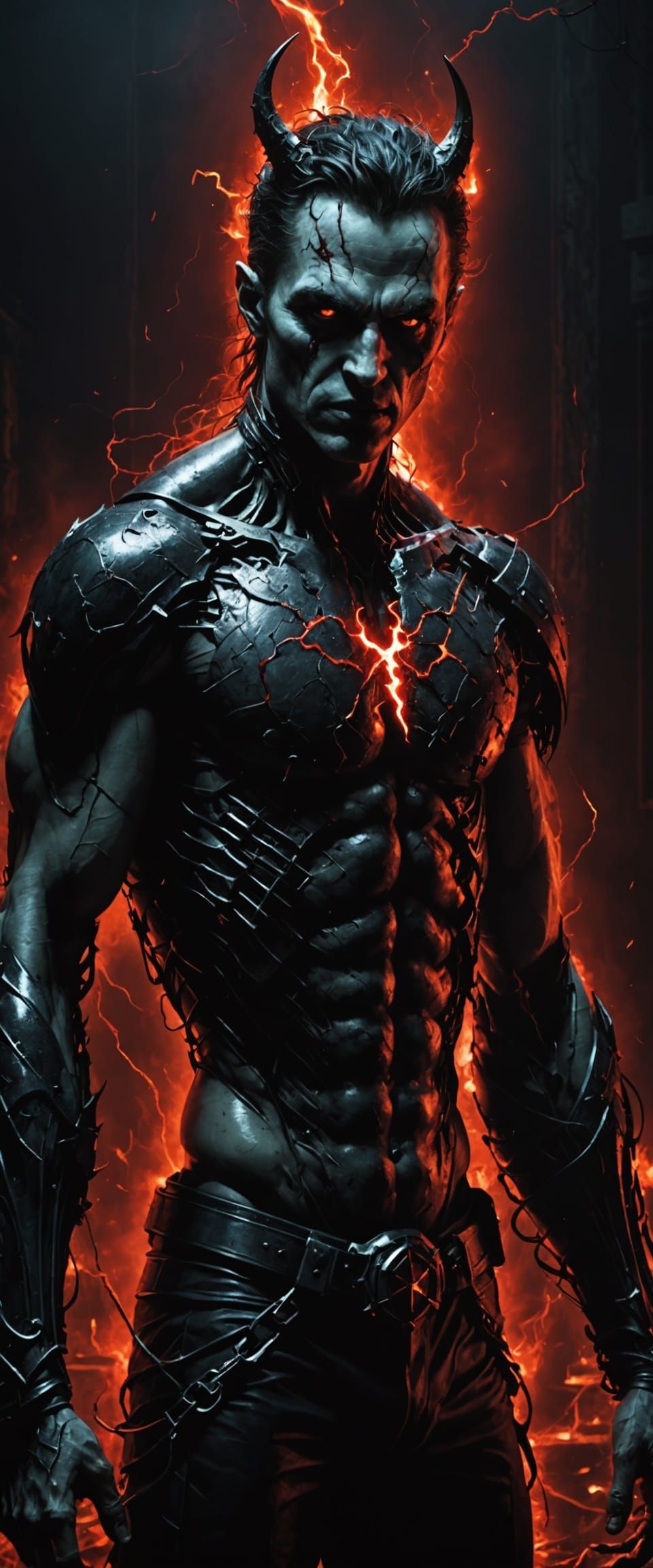 This hyperrealistic image captures a dynamic demonic figure illuminated by morbid chiaroscuro lighting, creating an atmospheric and epic masterpiece with ominous intricate details.