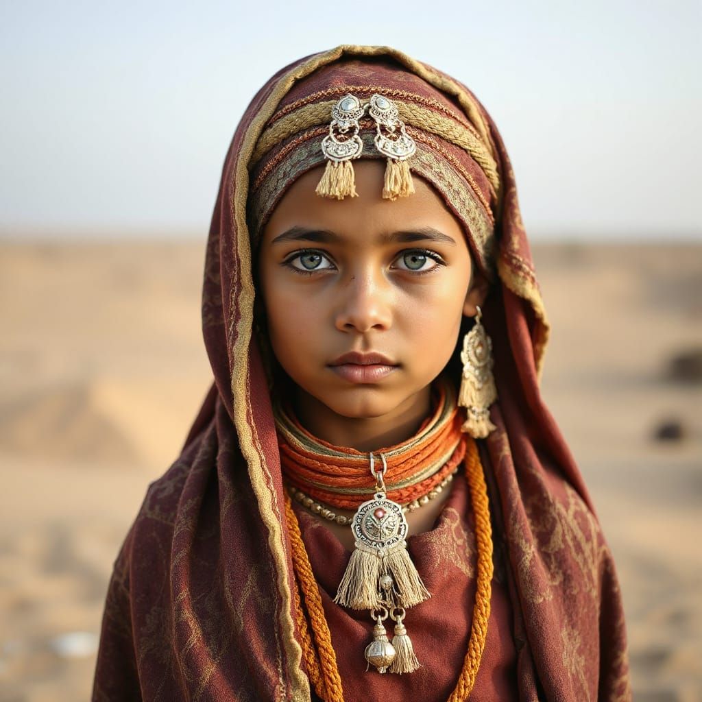 This image shows a young woman dressed in traditional desert clothing with striking blue eyes. The artwork features a vibrant Middle Eastern aesthetic.