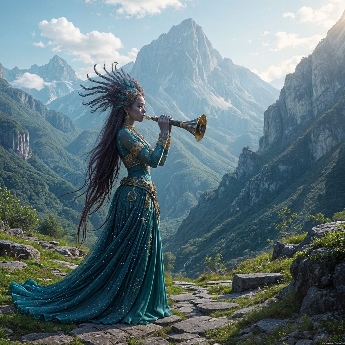 This hyperrealistic image depicts an alien woman with holographic skin playing a horn on a mossy path. Ethereal mist and glowing flora surround ancient ruins, blending photorealism with surrealism.