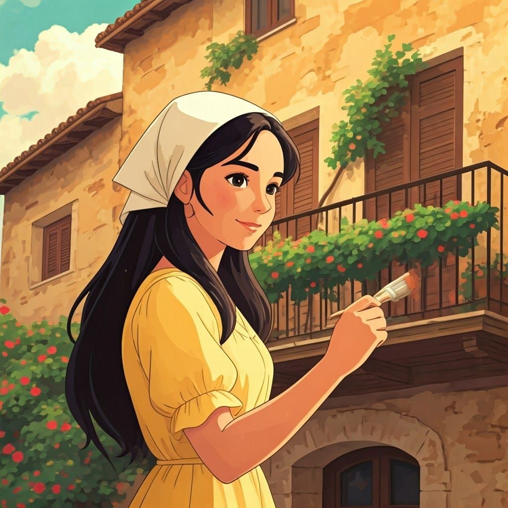 This image shows a young woman painting her house in Italy. She is dressed in a yellow dress and kerchief, and the house is surrounded by flowers and greenery in a Ghibli-inspired anime aesthetic.