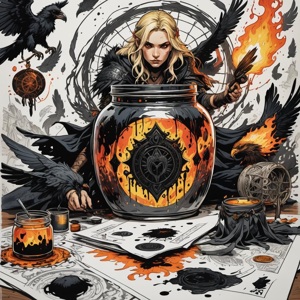 This image shows a complex concept art piece featuring an overturned ink jar. The spilled ink transforms into a Valkyrie with shield and ravens, set against a backdrop of surreal elements. Rendered with hyperrealistic detail and vibrant colors.