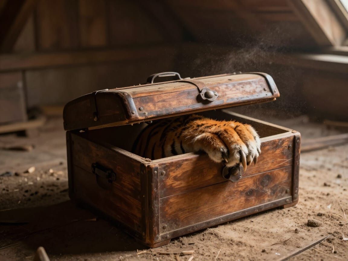 This image depicts a realistic scene of a tiger's paw emerging from an old, dusty box in a dimly lit attic. Warm, earthy tones and subtle dust particles create an atmosphere of suspense.