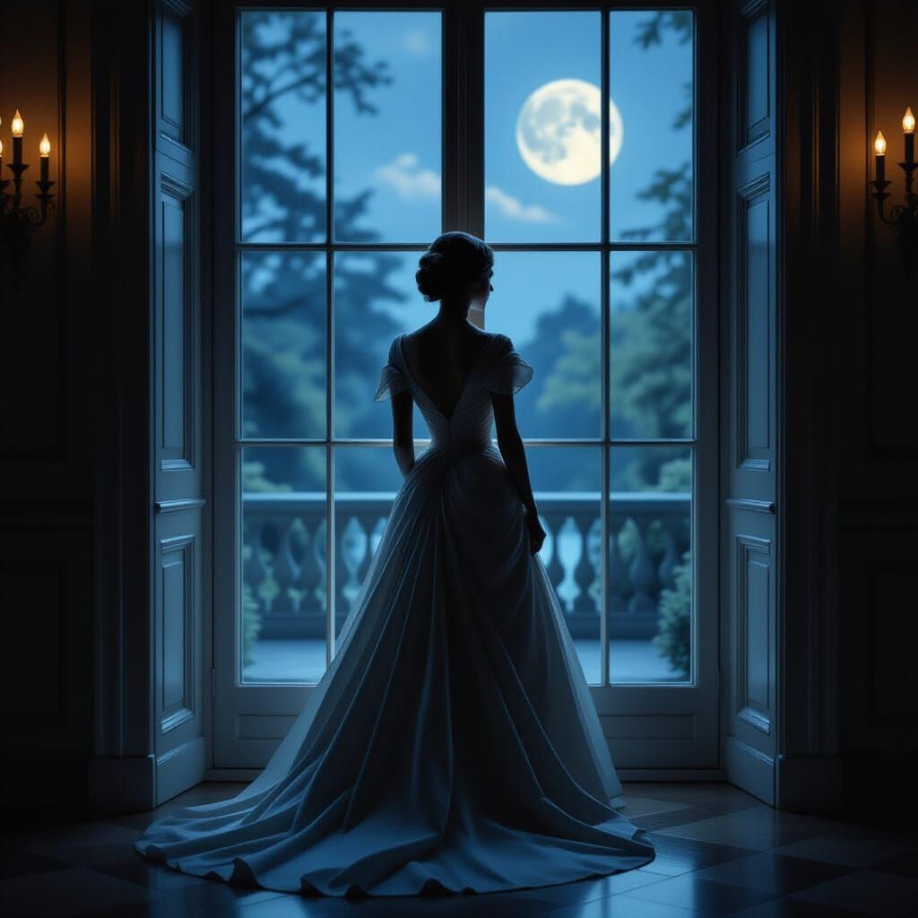 This image captures a woman in a vintage gown looking from a ballroom window to a moonlit garden, evoking lost glamour. Rendered with soft focus and rich tones of vintage photography.