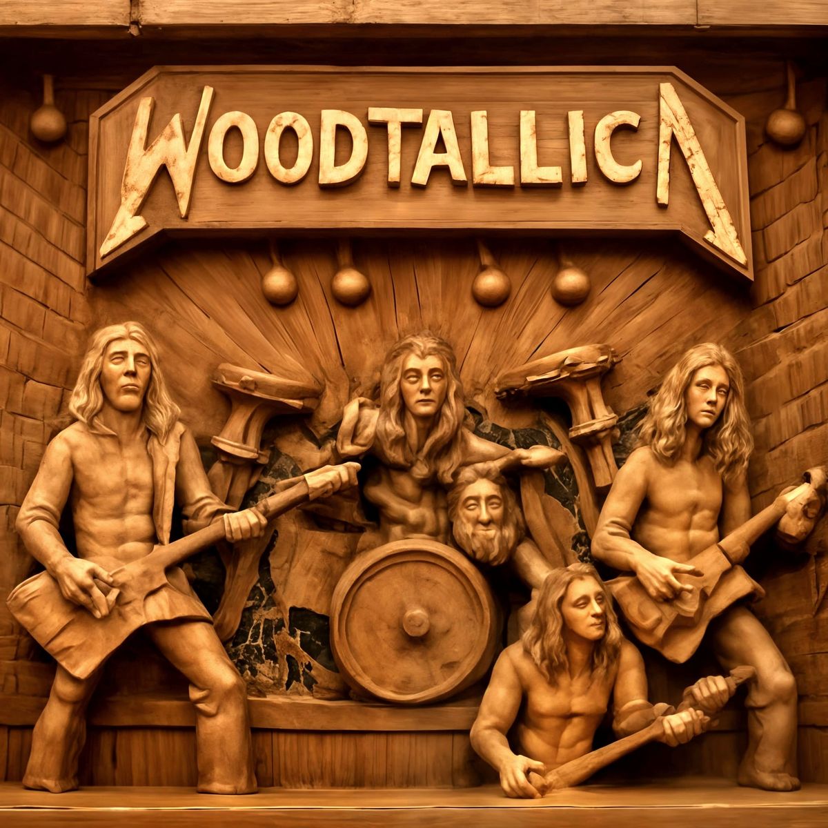 This image depicts Metallica in concert, rendered entirely from detailed wood carvings. The stage features a sign reading "WOODTALLICA", completing this unique artistic interpretation.