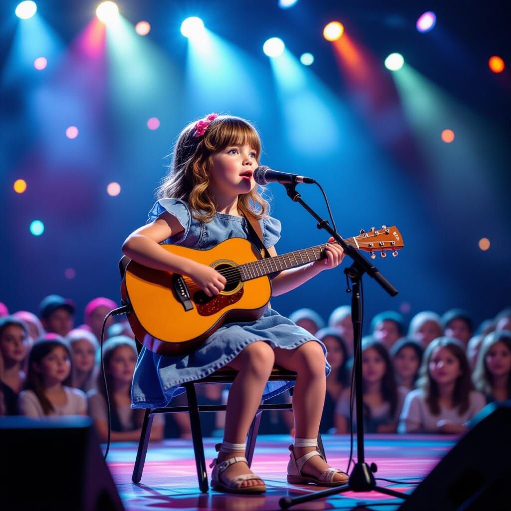 This image shows a young girl performing on a brightly lit stage. She is singing and playing a small guitar, depicted with vibrant colors and dramatic lighting in a dreamy, whimsical style.