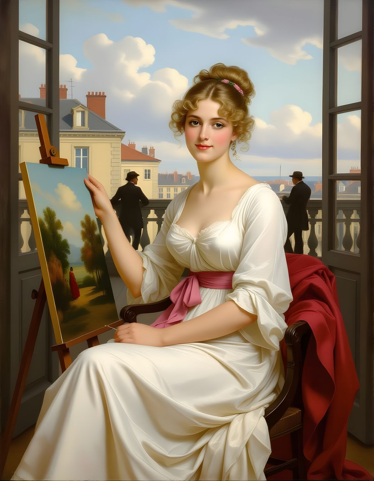 This image shows a beautiful woman holding up a canvas with a landscape painting on it. She is wearing a flowing white dress and has a gentle smile in a style reminiscent of Neoclassical portraiture.