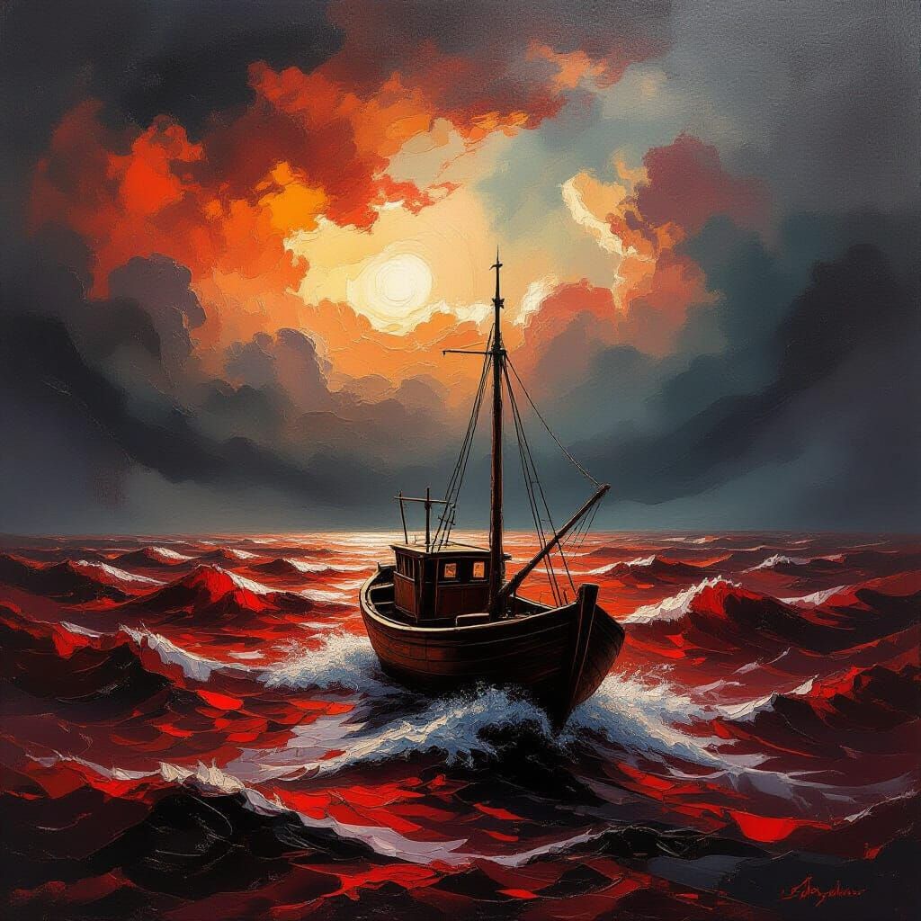 This image shows a dramatic, expressionist landscape of a turbulent ocean and sky merged into one. Rendered in thick, swirling strokes of red and copper, it features a tiny boat battling crimson waves.