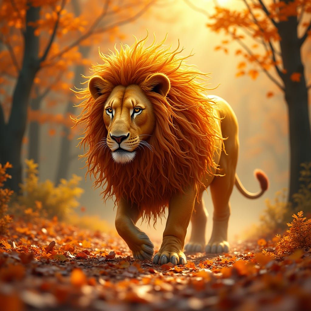 A majestic lion made entirely of golden autumn leaves, its mane blowing gently in the breeze as it prowls through a forest of color