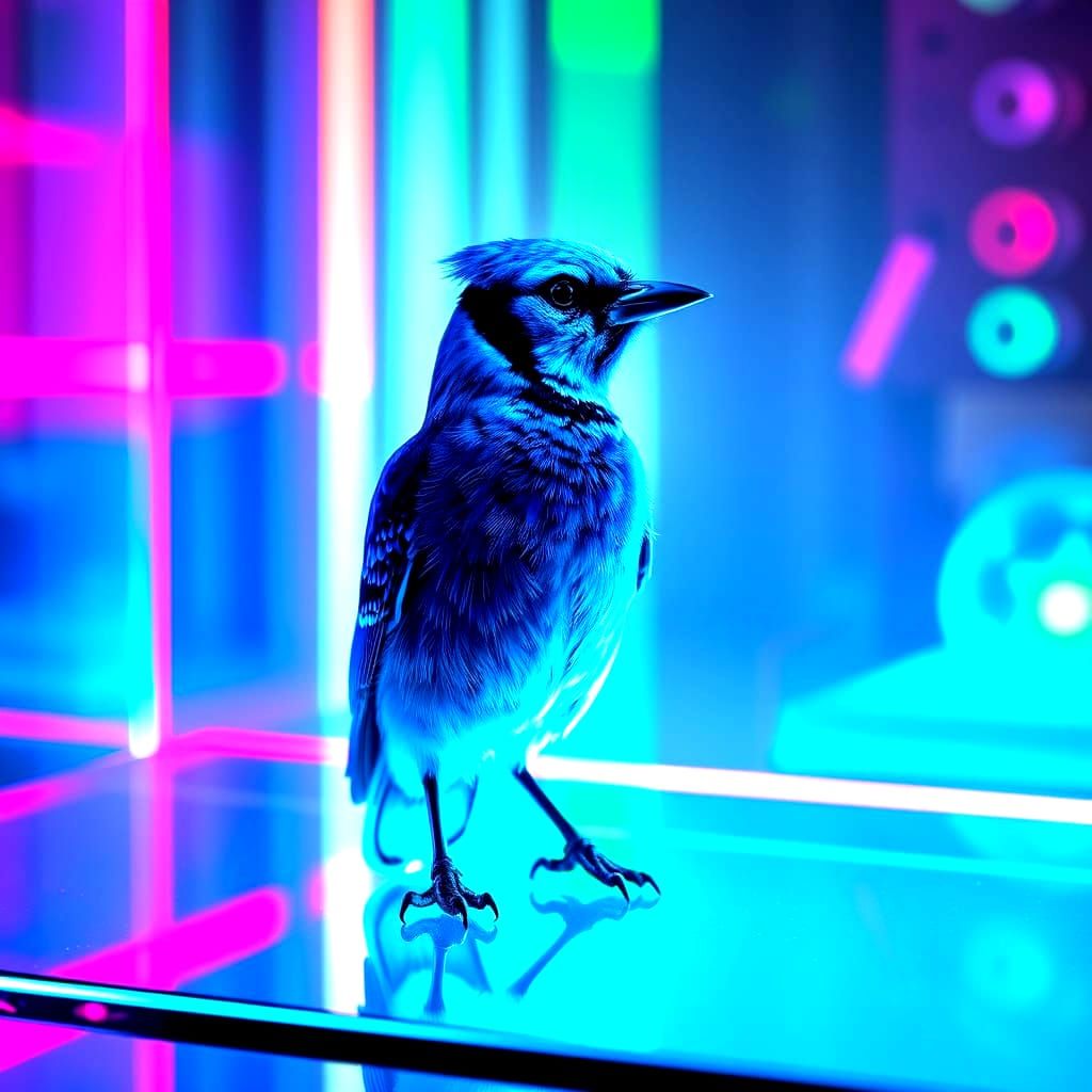 This image shows a stunning bird with a vibrant glass-like sheen to its feathers, radiating with a mesmerizing array of fluorescent colors