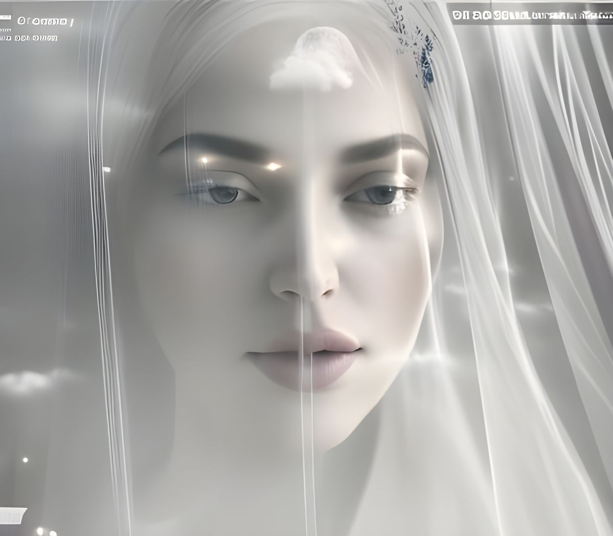 A striking picture of a cosmic goddess behind a veil. The image features swirling clouds, intricate details, and a medium light with glowing dust, creating an elegant and ethereal scene.