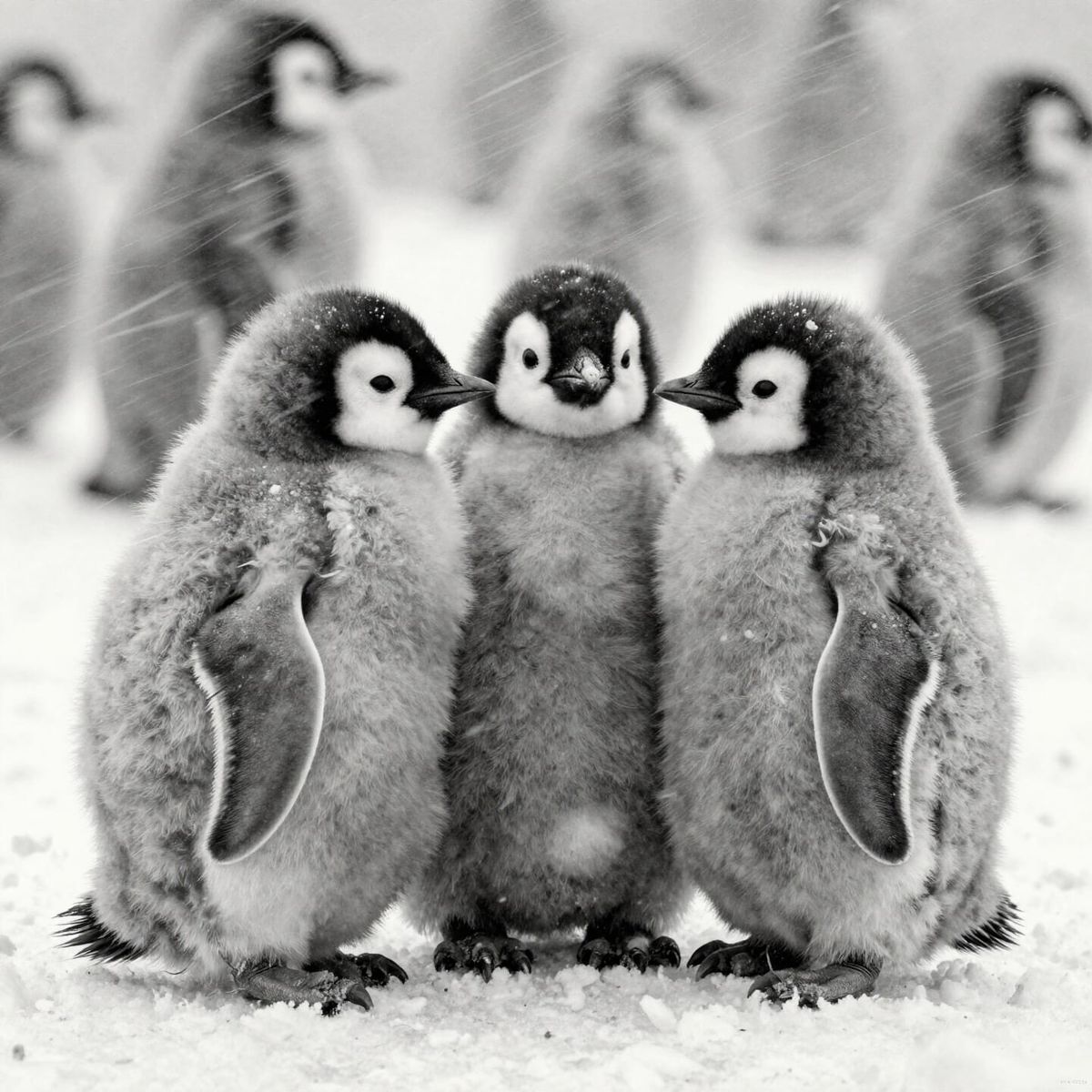 A highly detailed graphite pencil drawing of three fuzzy penguin chicks pressed together for warmth in a snowstorm. Their downy plumage creates a spherical, disheveled look, showcasing stoic endurance.