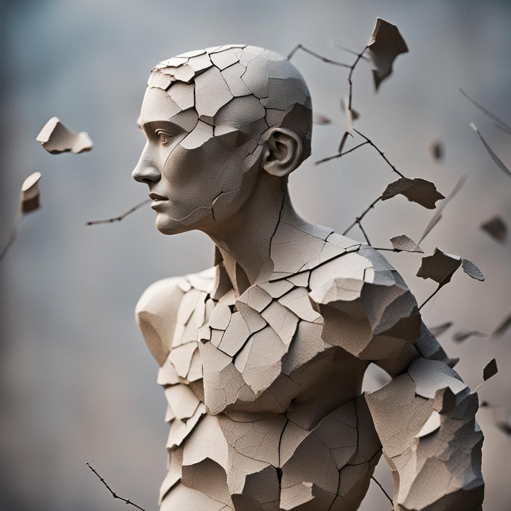 A photograph of cracked sculptural figures embodying imperfect beauty. The image features a shallow depth of field, natural lighting, and sharp focus reminiscent of professional DSLR photography.