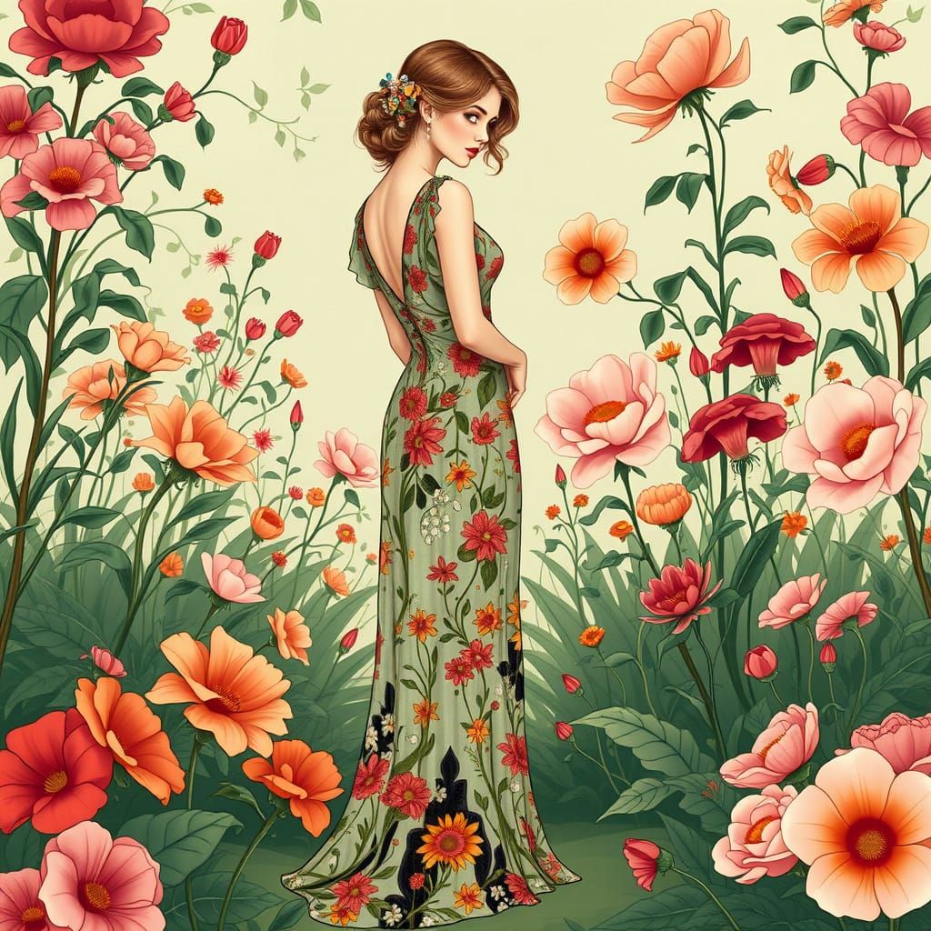 This image shows a woman in a floral dress in a peaceful garden full of flowers. The art is reminiscent of art nouveau, with flowing lines, intricate patterns, and a delicate, whimsical feel.