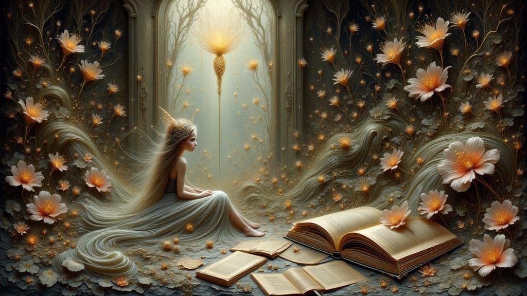 A digital painting of an old fairytale book with warm lighting and soft shadows. The image, inspired by magical libraries, has a whimsical fantasy aesthetic.