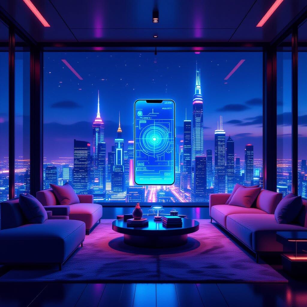 This image depicts a luxurious penthouse with minimalist furniture and neon lighting, offering a view of a futuristic city. Features a holographic phone displaying data, rendered in a vibrant digital art style.
