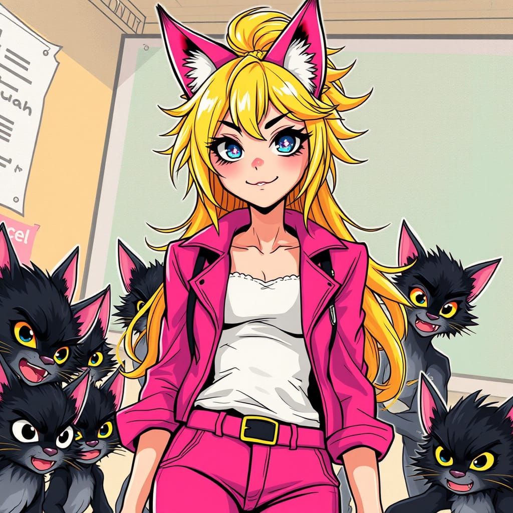 This image showcases a confident teacher with feline ears and sun-kissed blonde hair, surrounded by her curious students. The artwork blends pop-art and anime styles with bold lines and vibrant colors, creating a playful and eye-catching scene.