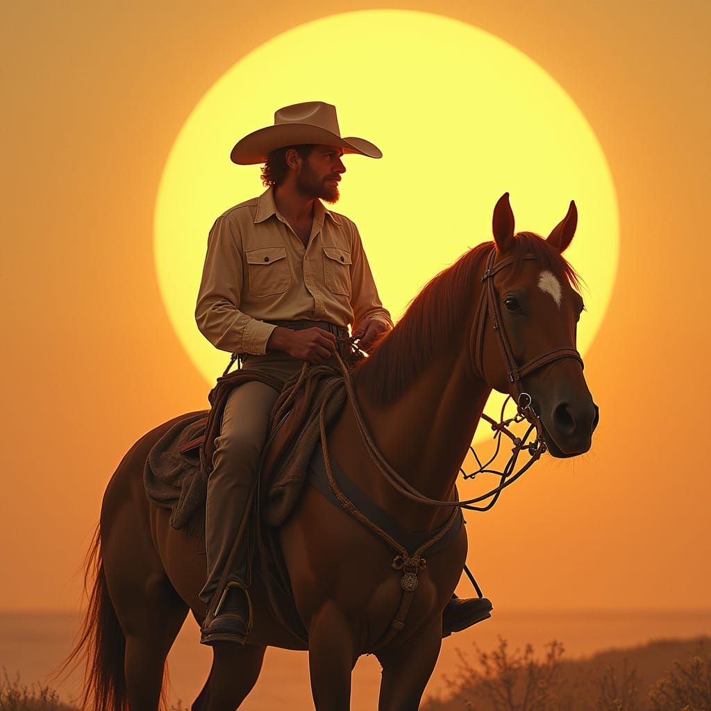 A striking picture of a cowboy on horseback silhouetted against a golden sunset. The horse is rearing up in a hyperrealistic style.