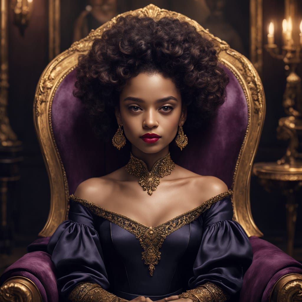 This image shows a striking digital portrait of a woman seated regally in a baroque chair. The piece features photorealistic details, cinematic lighting, and a rich color palette.